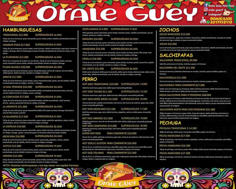 Nuestra carta ofrece una amplia variedad de platos de comida rápida, como: Gran variedad de Hamburguesas con carne artesanal, Hambur Piza, Perros Calientes, Jochos, Salchipapas, Pechuga, Patacón, Sandwich, Tacos, Nachos, Burritos, Mazorcadas,Quesadillas y una gran variedad de bebidas